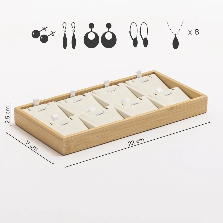 - Format compact : 8 présentoirs avec encoches pour boucles d’oreilles et languette pour pendentifs